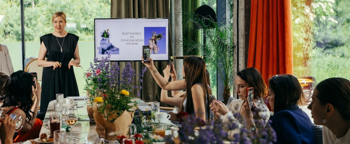 Модерувала модний бранч Ірина Татаренко, шеф-редакторка Marie Claire. Вона розповіла, як українські дизайнери трактують сталість у своїй діяльності: звертаються до інноваційних технологій, використовують у колекціях перероблені тканини, створюють фурнітуру з переробленого пластику, гарантують пожиттєвий ремонт речам, дарують друге життя одягу тощо.